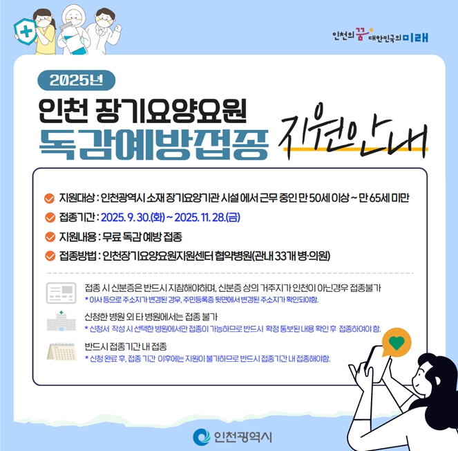 [파이낸셜경제=김기보 기자] 인천광역시는 노인 감염취약시설인 장기요양기관 종사자 1만여 명의 건강권 확보와 처우 개선을 위해 오는 9월 30일부터 11월 28일까지 약 9주간 무료 독감 예방접종을 실시한다고 밝혔다.