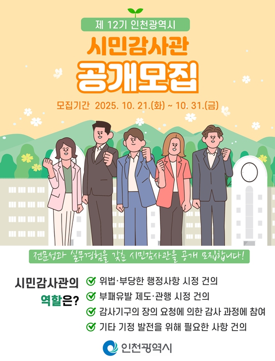 [파이낸셜경제=김기보 기자] 인천광역시는 제12기 시민감사관을 10월 21일부터 10월 31일까지 공개모집한다고 밝혔다.