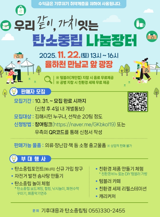 [파이낸셜경제=김예빈 기자] 김해시는 김해시기후환경네트워크와 함께 오는 22일 율하유적전시관 앞 광장 일원에서 ‘우리 같이, 가치 잇는 탄소중립 나눔장터’를 개최한다고 20일 밝혔다.