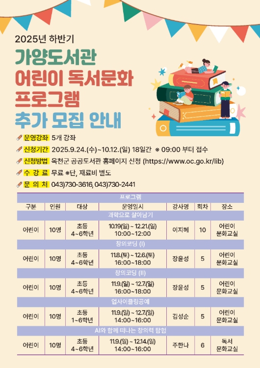 [파이낸셜경제=김기보 기자] 옥천 가양도서관은 군민의 독서문화활동을 지원하기 위해 하반기 어린이 독서문화프로그램 수강생을 추가 모집한다.