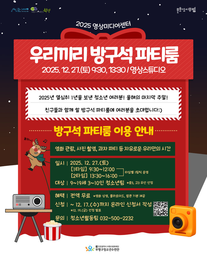 박건호 청소년수련관장은 “2025년 마지막 주말, 청소년들이 수련관에서 또래와 즐거운 추억을 만드는 시간이 되었으면 좋겠다”고 말했다.