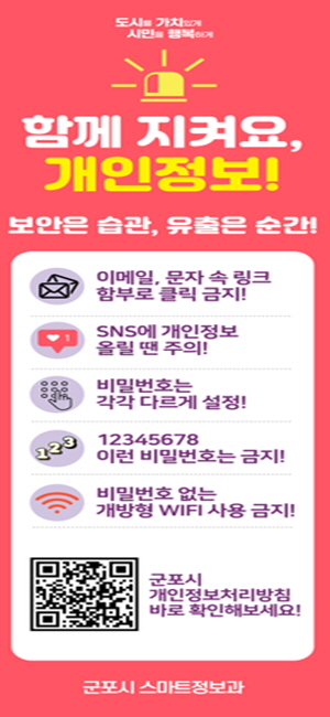 하은호 군포시장은 “개인정보 보호는 작은 관심과 실천에서 시작된다”며 “이번 캠페인이 개인정보 보호에 대한 시민들의 공감대를 넓히고 안전한 정보 환경을 만드는 계기가 되기를 바란다”고 전했다.