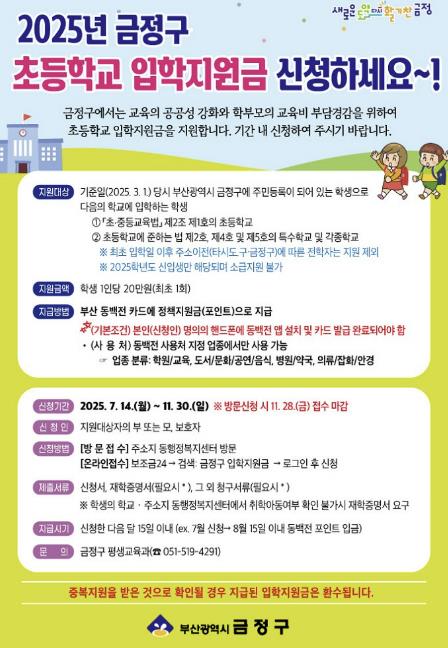 ‘2025년 금정구 초등학교 입학지원금’신청은 7월 14일부터 신청 가능하며, 지원 대상은 2025년 3월 1일 기준으로 금정구에 주민등록이 되어 있고 초등학교에 최초 입학하는 학생으로, 소득 수준과 관계없이 지원 대상자의 부모 또는 보호자(친권자, 후견인, 또는 그 밖의 사람으로서 지원 대상자를 사실상 보호・양육하고 있는 자)가 신청할 수 있다.