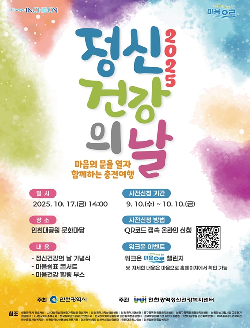 [파이낸셜경제=김기보 기자] 인천광역시는 10월 17일 인천대공원 문화마당에서 ‘마음의 문을 열자, 함께하는 충전 여행’이란 주제로‘2025년 정신건강의 날 기념행사’를 개최한다.