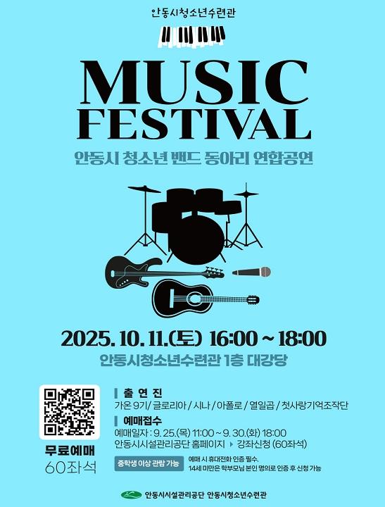 [파이낸셜경제=김지훈 기자] 안동시시설관리공단에서 운영하는 안동시청소년수련관이 '2025 안동시 청소년 밴드 동아리 연합공연 ‘뮤직 페스티벌’'을 오는 10월 11일 청소년수련관 대강당에서 개최한다고 밝혔다.