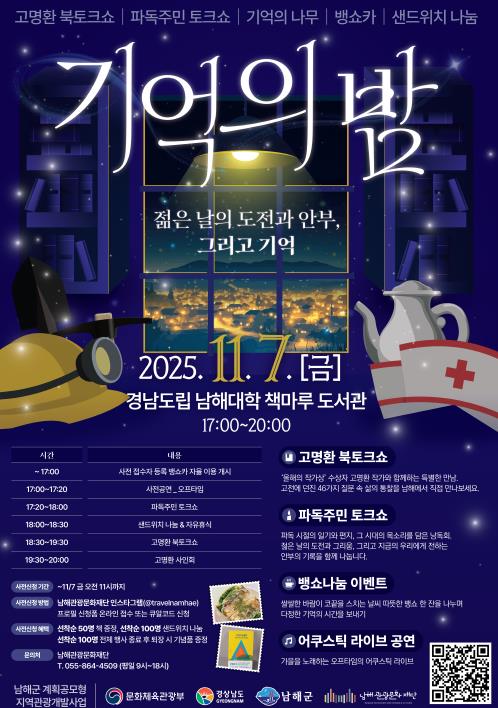 한편 독일마을 기억의 밤 프로그램 사전신청은 남해군청 새소식란의 참여링크 또는 남해군관광문화재단 공식 인스타그램 계정의 프로필통해 신청할 수 있으며, 기타 문의는 미래콘텐츠사업팀으로 연락하면 된다.