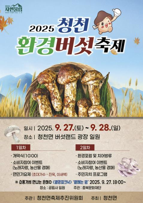 체험 프로그램으로는 △어반 드로잉 △공예 체험 △버섯 피자 만들기 △즉석 사진 촬영 등 남녀노소 누구나 즐길 수 있는 콘텐츠가 진행되며, △청천 농특산물 판매장터도 함께 운영돼 건강한 지역 먹거리를 직접 만나볼 수 있다.