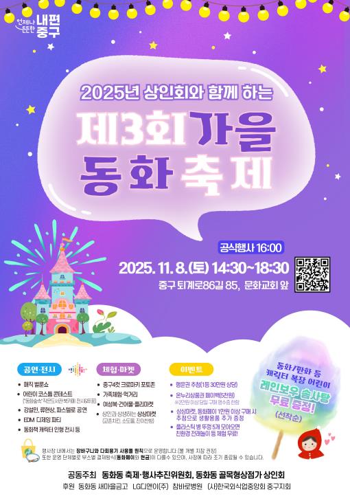 [파이낸셜경제=김예빈 기자] 서울 중구 동화동 문화교회(퇴계로86길 85) 일대가 오는 11월 8일 오후 2시 30분부터 6시 30분까지 ‘제3회 상인회와 함께하는 가을동화축제’로 들썩인다.