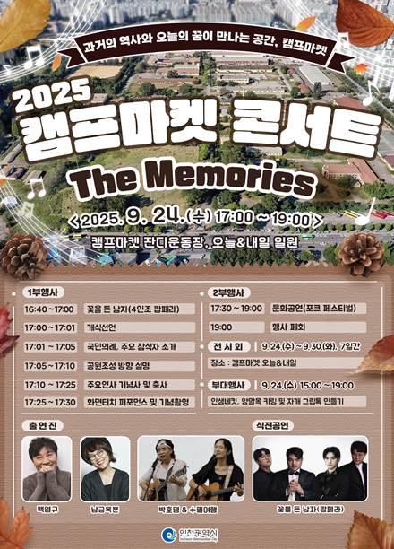 [파이낸셜경제=김기보 기자] 인천광역시는 오는 9월 24일 오후 5시, 부평 캠프마켓 개방공간인 잔디운동장에서 ‘2025 캠프마켓 콘서트 The Memories’를 개최한다고 밝혔다.