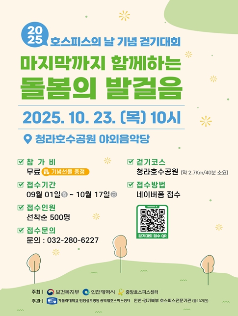 [파이낸셜경제=김기보 기자] 인천광역시는 호스피스·완화의료에 대한 시민들의 이해를 높이고 생명존중 문화를 확산하기 위해 오는 10월 23일 오전 10시, 청라호수공원에서 ‘2025년 호스피스의 날 기념 걷기대회’를 개최한다고 밝혔다.