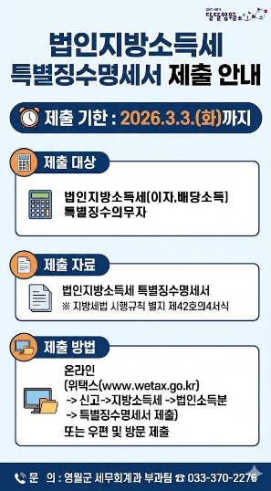 [파이낸셜경제=조성환 기자] 영월군은 법인지방소득세 이자‧배당소득 특별징수의무자를 대상으로 3월 3일까지 특별징수명세서를 제출해야 한다고 밝혔다.