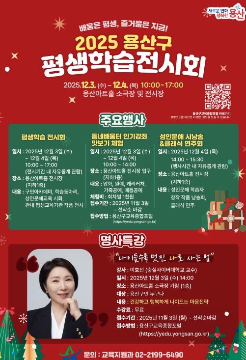 [파이낸셜경제=김예빈 기자] 서울 용산구가 오는 12월 3일부터 4일까지 용산아트홀 전시장과 소극장에서 ‘배움은 평생, 즐거움은 지금!’을 주제로 ‘2025 평생학습 전시회’를 개최한다.