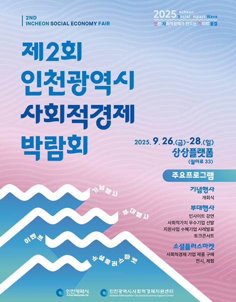 [파이낸셜경제=김기보 기자] 인천광역시는 오는 9월 26일부터 28일까지 3일간, 인천 중구 상상플랫폼 웨이브홀에서 ‘제2회 인천광역시 사회적경제박람회’를 개최한다고 밝혔다.