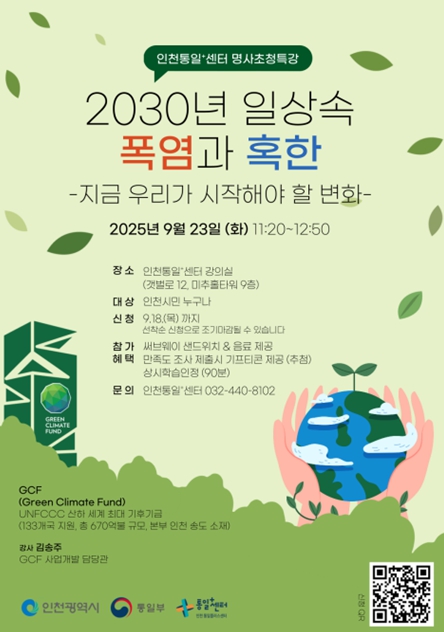 [파이낸셜경제=김기보 기자] 인천광역시는 9월 23일 인천통일플러스센터(연수구 송도동 소재)에서 녹색기후기금(GCF)의 전문가를 초청, 기후위기의 심각성과 대응방안을 주제로 하는 특별 강연을 개최했다고 밝혔다.