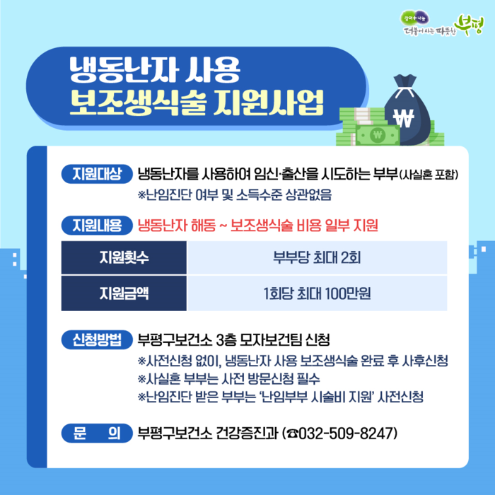 [파이낸셜경제=김기보 기자] 부평구(구청장 차준택)는 아이를 원하는 부부의 임신·출산을 적극적으로 지원하기 위해 ‘냉동 난자 사용 보조생식술 지원사업’을 진행한다고 12일 밝혔다.