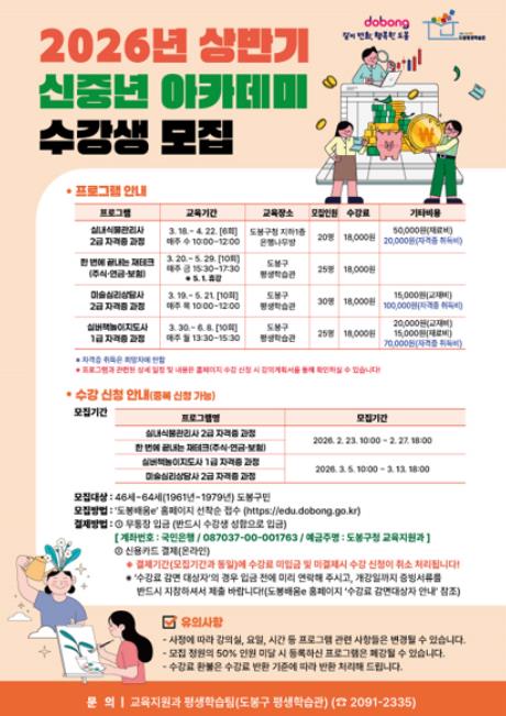 [파이낸셜경제=김예빈 기자] 서울 도봉구가 2026년 상반기 신중년 아카데미 수강생을 모집한다. 이번 상반기는 신중년들이 제2의 인생을 준비할 수 있는 인생재설계 과정과 직업 역량 강화를 위한 강의로 구성된다.