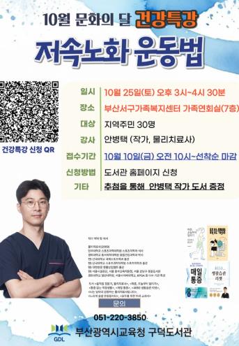 [파이낸셜경제=박영진 기자] 부산광역시립구덕도서관은 오는 25일 오후 3시 서구가족복지센터에서 지역주민 30명을 대상으로 ‘저속노화 운동법’ 특강을 개최한다.