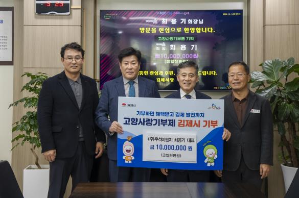 [파이낸셜경제=김예빈 기자] 김제시는 2일 ㈜우석이엔씨 최용기 회장이 김제시 고향사랑기부제에 1,000만원을 기탁했다고 밝혔다.