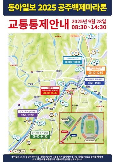 아울러 풀코스 반환점이 있는 나래원 방향의 백제큰길도 오전 8시 50분부터 오후 2시 30분까지 통제된다.