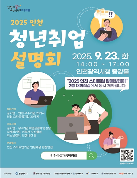설명회는 인천시와 중부지방고용노동청, 인하대학교·인천대학교·인하공업전문대학·재능대학교 대학일자리플러스센터가 공동 주최하며, ‘2025년 인천 상설 채용박람회’의 네 번째 일정으로 진행된다.