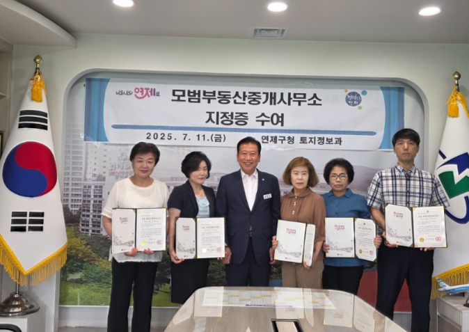 [파이낸셜경제=박영진 기자] 부산시 연제구는 7월 11일 관내 부동산중개업소 5개소를 대상으로 '모범 부동산중개사무소 지정증 전달식'을 개최했다.