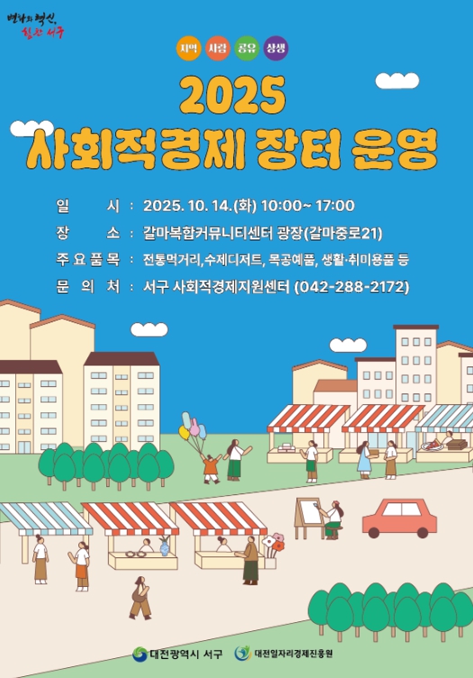 [파이낸셜경제=김영란 기자] 대전 서구는 이달 14일 오전 10시부터 오후 5시까지 갈마복합커뮤니티센터 광장에서 지역·사람·공유·상생을 주제로 한 ‘2025 사회적경제장터’를 운영한다.