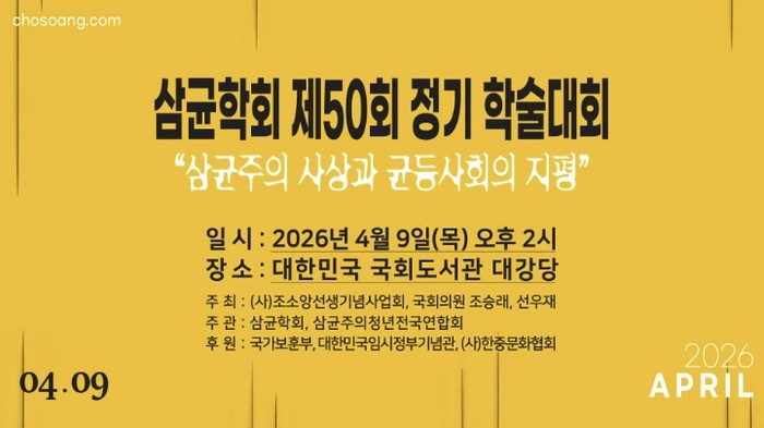 [파이낸셜경제=김기보 기자] 2026년 병오년(丙午年)을 맞아 '삼균학회 제50회 정기학술대회'가 국회도서관 대강당에서 개최된다. 이번 학술대회는 (사)조소앙선생기념사업회, 조승래 국회의원실, (사)선우재가 공동 주최하고, 삼균학회와 삼균주의청년연합회가 주관하며, 국가보훈부, 국립대한민국임시정부기념관, (사)한중문화협회가 후원한다.