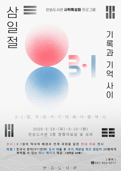 [파이낸셜경제=박영진 기자] 부산시교육청 부산광역시립반송도서관은 26일부터 3월 10일까지 반송도서관에서 시민들을 대상으로 사학 특성화 프로그램 ‘3·1절, 기록과 기억 사이’를 운영한다.