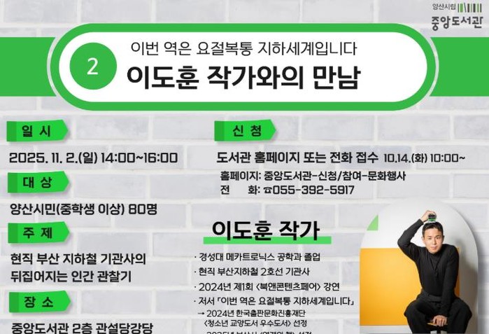 [파이낸셜경제=김예빈 기자] 양산시립 중앙도서관은 11월 2일 이도훈 작가를 초청해 작가와의 만남 행사를 개최한다.