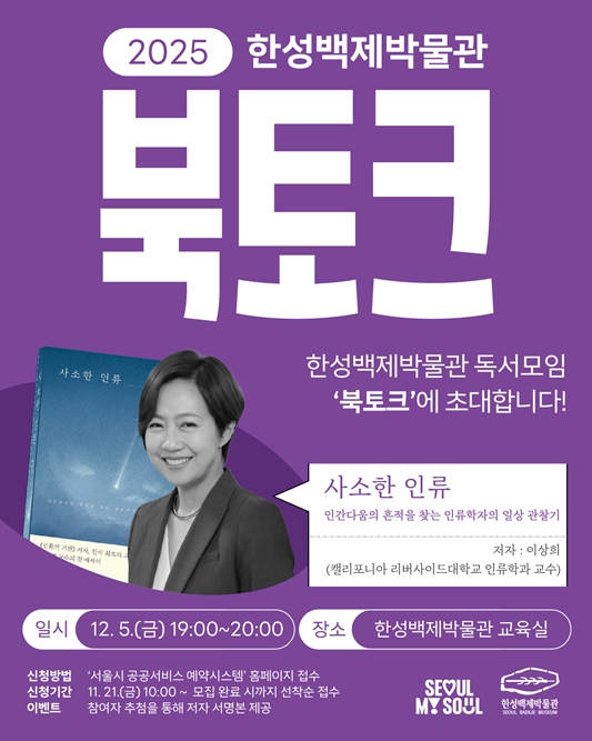 [파이낸셜경제=김예빈 기자] 서울시 한성백제박물관은 올해 두 차례 운영된 역사독서모임 ‘북토크’를 12월 5일에 추가 개최한다고 밝혔다. 당초 연 2회 운영했으나 높은 시민 호응에 힘입어 추가 편성을 결정한 것이다. 이번 행사는 서울시 대표 야간문화 프로그램 ‘문화로 야금야금(夜金)’의 일환으로, 금요일 밤 박물관에서 역사학·고고학 분야 저자와 시민이 직접 소통할 수 있는 자리로 마련됐다.