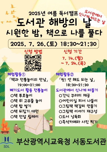 [파이낸셜경제=박영진 기자] 부산광역시립서동도서관(관장 최인경)은 오는 26일 오후 6시 30분부터 서동도서관에서 7~9세 어린이와 보호자 20팀을 대상으로 ‘2025 여름 독서캠프-도서관 해방의 날’ 프로그램을 운영한다.