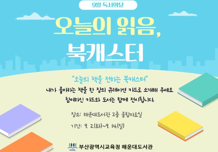 [파이낸셜경제=박영진 기자] 부산광역시립해운대도서관은 오는 9월 2일부터 14일까지 해운대도서관에서 지역 주민을 대상으로 ‘오늘의 읽음, 북캐스터’행사를 운영한다.