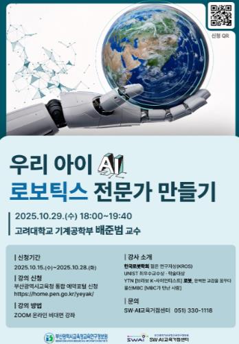 강연은 고려대학교 배준범 교수(기계공학부)가 맡아 ‘우리 아이(AI) 로보틱스 전문가 만들기’를 주제로 진행한다.