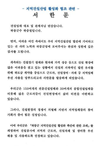 | ▲ 하승철 하동군수, 지역건설산업 활성화를 위한 서한문 발송 |