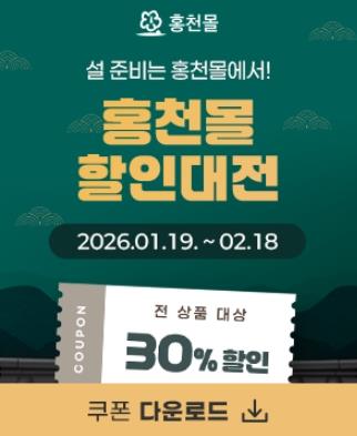 | ▲ 홍천군 온라인 쇼핑몰 “홍천몰” 설맞이 기획전 전 상품 30% 할인쿠폰 이벤트 |
