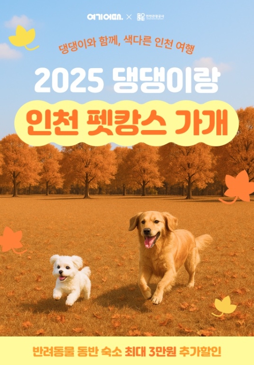 [파이낸셜경제=김기보 기자] 인천관광공사는 반려동물 동반 여행 활성화를 위해 대한민국 대표 종합 여행·여가 플랫폼 “여기어때”와 함께 '2025 댕댕이랑 인천 펫캉스 가개' 온라인 숙박 할인 기획전을 9월 24일부터 11월 30일까지 개최한다고 밝혔다. 이번 기획전은 반려동물과 함께하는 여행 수요가 꾸준히 증가하는 가운데, 인천을 대표적인 반려동물 친화 관광도시로 널리 알리기 위해 마련됐다.