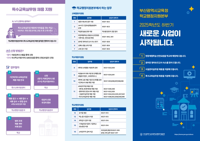 부산광역시교육청학교행정지원본부는 2025학년도 하반기부터 확대 시행되는 학교 지원 신규 사업 4가지를 소개하는 홍보 리플릿을 제작해 부산 관내 모든 학교에 배포한다고 14일 밝혔다.