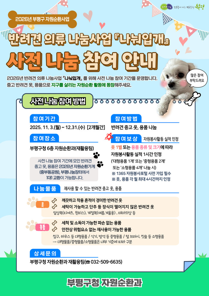 [파이낸셜경제=김기보 기자] 부평구(구청장 차준택)는 내년에 개최 예정인 반려견 의류 나눔사업 ‘나눠입개’에 앞서 ‘사전 나눔 참여 기간’을 운영한다.
