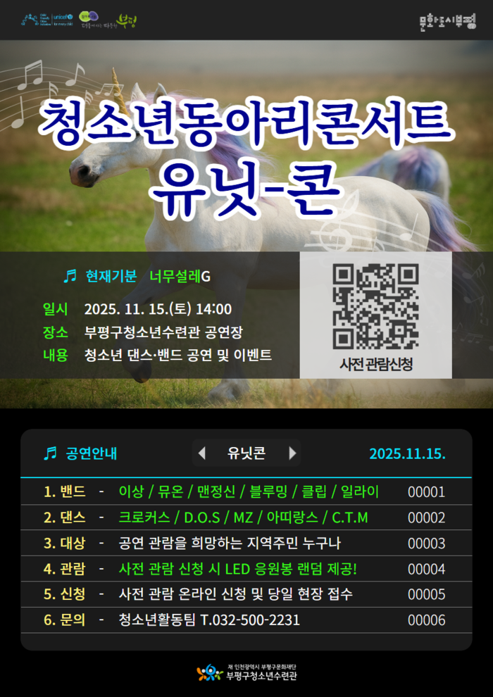 박건호 청소년수련관장은 “유닛콘은 청소년들이 무대에서 자신들의 가능성을 표현하고, 지역사회가 함께 응원하는 축제”라며 “많은 분들이 함께해 청소년들의 도전과 성장을 응원해주시길 바란다”고 전했다.