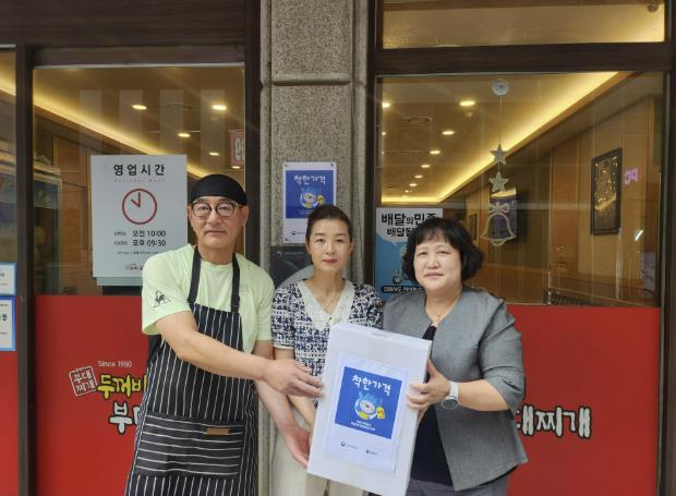 | ▲ 전미숙 부천시 지역경제과장이 ‘착한가격업소’ 상반기 신규 지정업소(두꺼비 부대찌개)에 인센티브를 전달하고 있다. |