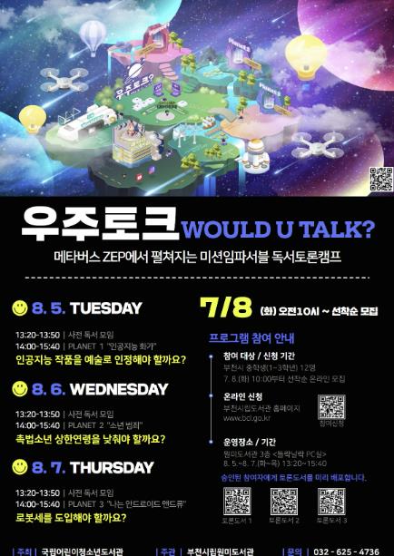 메타버스 기반 독서 프로그램은 중학생 12명을 대상으로 8월 5일부터 7일까지 총 3회에 걸쳐 진행된다. 참가자들은 ‘인공지능 쫌 아는 10대’ 등 무상으로 제공된 책 3권을 읽고, ‘인공지능의 창작활동’, ‘소년 범죄’, ‘로봇세’를 주제로 메타버스 플랫폼 ‘우주 토크’를 활용해 토론에 참여한다.