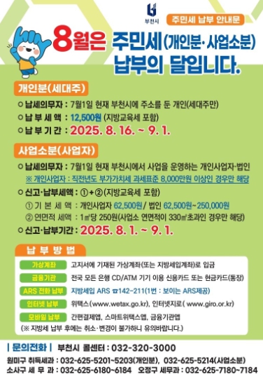 [파이낸셜경제=김기보 기자] 부천시는 8월 ‘주민세 납부의 달’을 맞아 정기분 주민세 90억 원을 부과하고, 9월 1일까지 납부해줄 것을 안내했다. 과세 대상은 7월 1일 기준 부천시에 주소를 둔 세대주와 사업소를 둔 개인과 법인 사업자다.