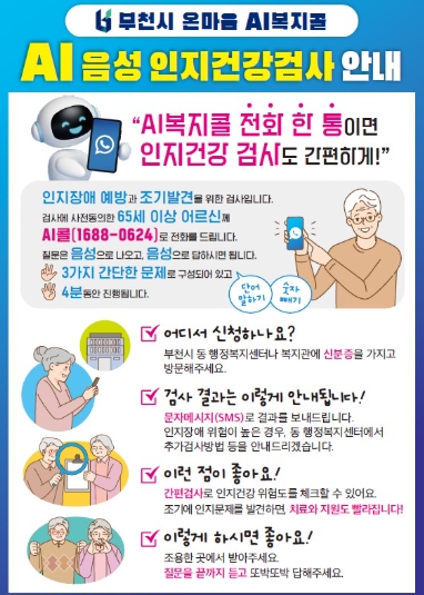 [파이낸셜경제=김기보 기자] 부천시는 8월부터 전국 최초로 ‘온마음 AI복지콜’을 활용한 인공지능(AI) 음성 기반 인지건강검사를 집중 추진하고 있다.
