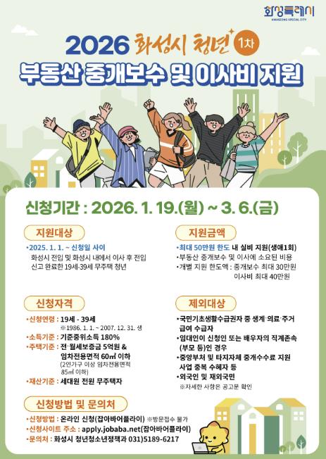 [파이낸셜경제=김기보 기자] 화성특례시가 19일부터 3월 6일까지 청년들의 주거비 부담 경감 및 정주 여건 향상을 위한 ‘2026년 상반기 청년 부동산 중개보수 및 이사비 지원사업’ 신청을 받는다.