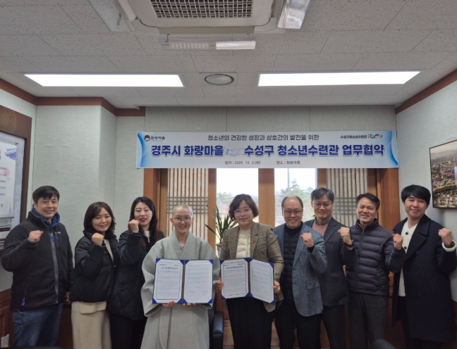 [파이낸셜경제=김지훈 기자] 경주시 청소년수련시설 화랑마을과 대구 수성구 청소년수련관은 지난 2일 화랑마을에서 청소년 활동 발전과 상호 협력 강화를 위한 업무협약을 체결했다.