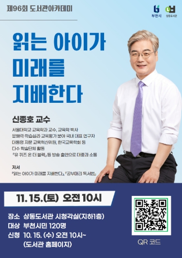 [파이낸셜경제=김기보 기자] 부천시는 11월 15일 오전 10시 부천시립상동도서관 시청각실에서 인공지능(AI)·디지털 시대 학습 경쟁력의 핵심인 문해력을 주제로 ‘제96회 도서관 아카데미’를 연다. 이번 강연은 ‘읽는 아이가 미래를 지배한다’의 저자이자 서울대학교 교육학과 교수인 신종호 교수를 초청해 진행한다.