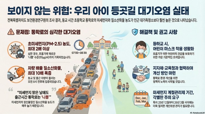 전경식 전북특별자치도 보건환경연구원장은 “이번 조사는 겉으로는 맑은 날씨라도 등굣길 통학로 주변 대기질이 어린이 건강에 결코 안전하지 않다는 점을 보여줬다”며 “앞으로도 대기오염물질에 취약한 어린이를 비롯한 민감계층 보호를 위한 정책 마련과 과학적 조사에 노력을 다하겠다”고 밝혔다.