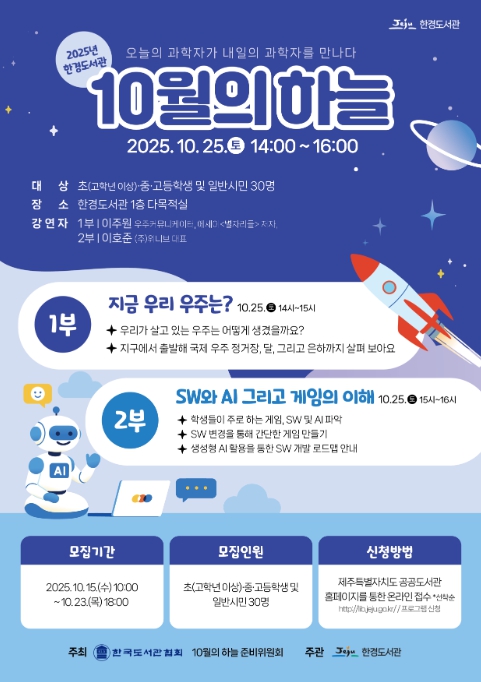 [파이낸셜경제=김영란 기자] 제주시 한경도서관은 한국도서관협회와 10월의 하늘 준비위원회가 공동 주최하는 ‘10월의 하늘: 과학자들의 재능기부 도서관 과학 강연’ 공모에 선정돼 오는 10월 25일 다목적실에서 강연을 개최한다.