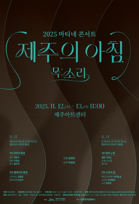 강동철 제주아트센터 소장은 “이번 공연은 클래식과 국악, 동서양 다양한 장르가 친절한 해설과 함께 어우러져 아침의 낭만을 선사할 특별한 무대”라며, “음악으로 여는 하루의 감동을 많은 시민과 함께 나누고 싶다”고 밝혔다.