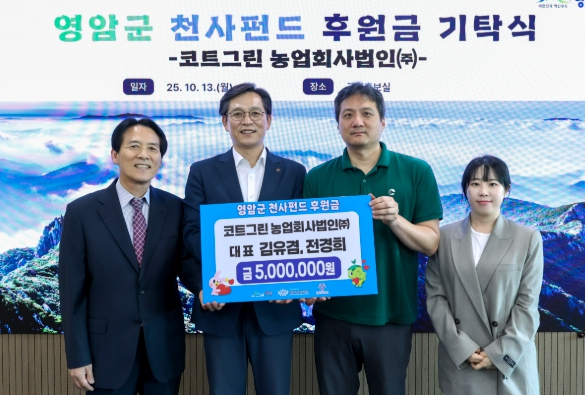 [파이낸셜경제=김예빈 기자] 코트그린농업회사법인(주)(대표 김유겸·전성희)가 13일 영암군청에 천사펀드 500만원, 고향사랑기부금 200만원을 각각 전달했다.